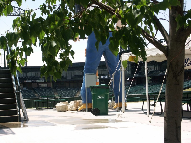 Le stade de baseball de Joliet, avec en premier plan la statue géante d'un joueur.