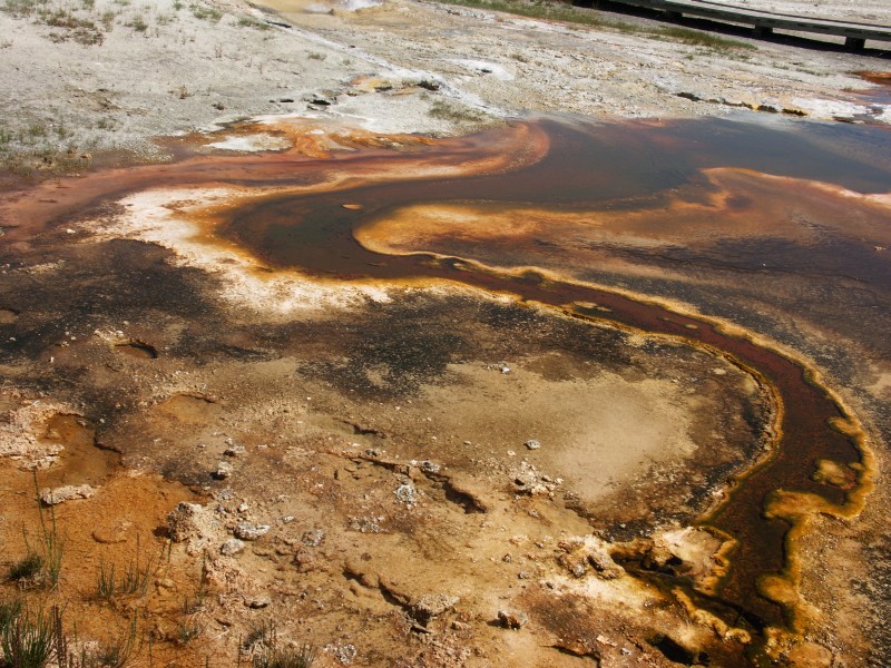 La couleur rouge n'est pas due à la présence de fer, mais à des bactéries qui se sont adaptées aux températures extrèmes des sources chaudes de Yellowstone.