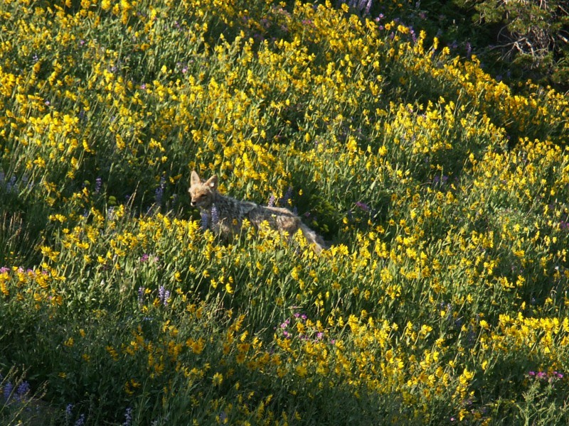 Dans la lumière du soir, au milieu des fleurs, un coyote nous regarde.
