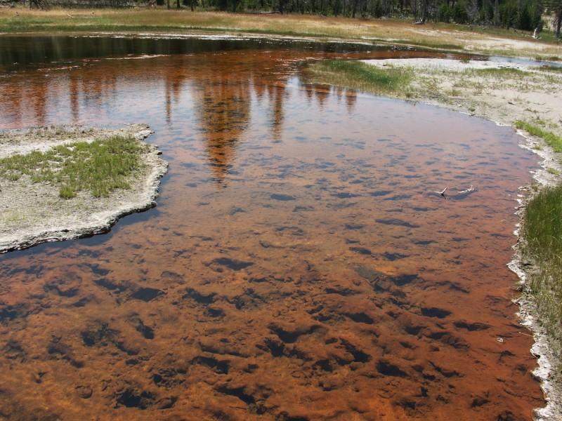 Rouge, jaune, vert, s'harmonisent avec le bleu du ciel autour des geysers.