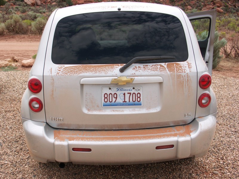 A l'arrivée, au départ du sentier, la voiture est couverte de poussière rouge.