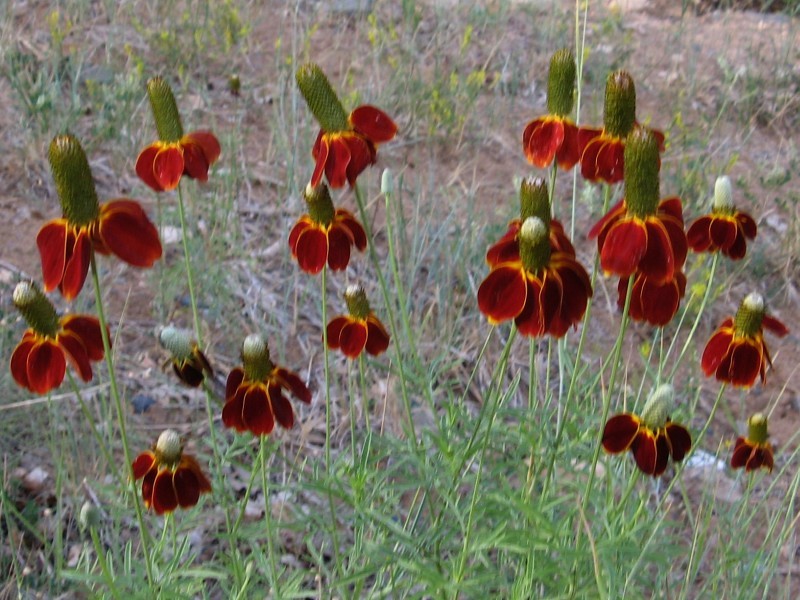 In side of the road, strange coneshaped burgundy and yellow flowers.